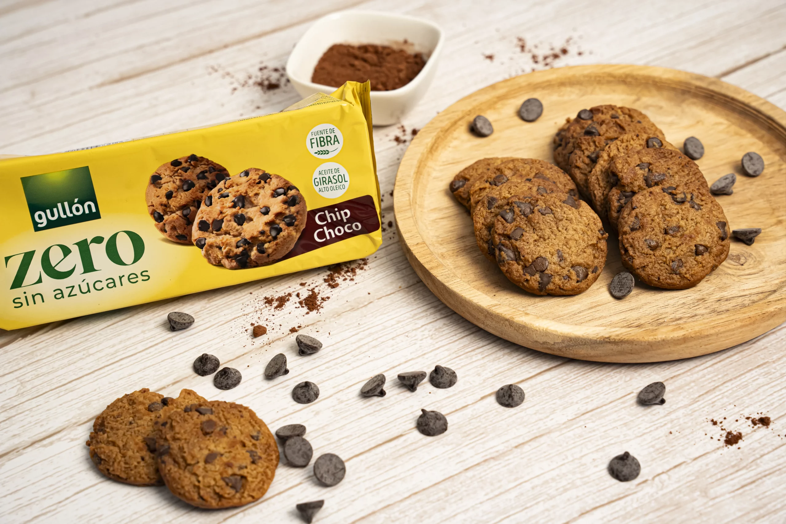Galletas Chip Choco Zero Sin Azúcares, tradicional galleta americana, con formas irregulares y pepitas de chocolate negro. Son fuente de fibra, están elaboradas con aceite de girasol alto oleico y contienen ZERO azúcares añadidos.